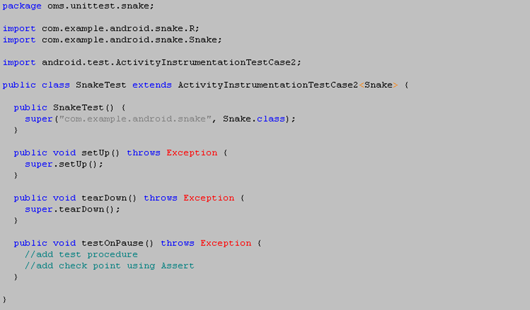 SnakeTest继承自ActivityInstrumentationTestCase2,是因为被测的Snake.java中定义的是Snake这个Activity的onCreate()和onPause()等,使用ActivityInstrumentationTestCase2的子类可以方便的对这些方法进行测试,并且能得到被测应用和测试应用本身的context和resource。当然,也可以使用InstrumentationTestCase的子类,自主控制Activity的启动和关闭。