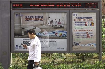 广渠家园内,运营商在宣传栏里贴出宽带广告