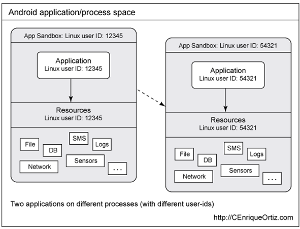下图显示了:两个 Android 应用程序,各自在其自己的基本沙箱或进程上,他们是不同的Linux user ID。