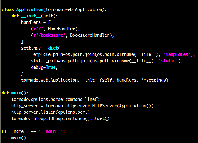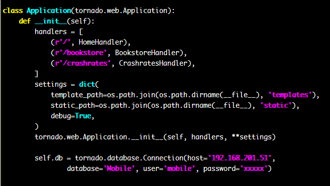 tornado.web.Application类的初始化,handlers是必须传入的固定参数,后面是一个可变长的参数列表。