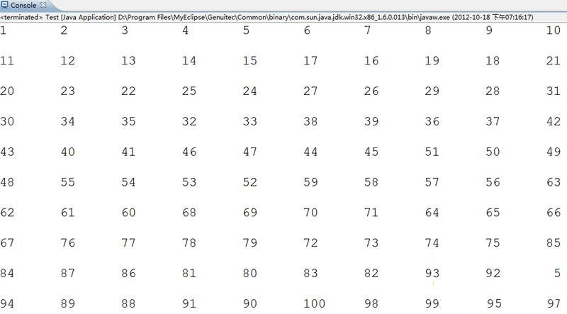 当然了,除了使用HashMap实现外,还有其它高效的方法。比如,我们可以把1-100这些数字存储在一个数组中,然后在for循环中随机产生两个下标,如果这两个下标不相等的话,可以交换数组中的元素,实现过程如下所示: