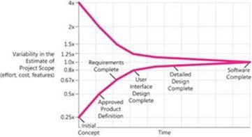 在一些语境中,项目的发展是可以预料的。图1.1摘自Steve McConnell所著的《软件估算》,它显示了(对项目范围、代价、功能的)估算值是如何随着项目的进展变得准确的[McConnell06]。随着时间的推移,项目的不确定性逐渐降低,当项目即将结束时,开发团队能够准确预期项目的结局。但是,图1.1也提示了在项目的开始阶段,项目的不确定性非常高。在初始概念(Initial Concept)阶段建立的估算值可能是实际值的4倍。