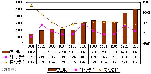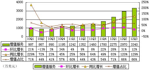 人人公司第三季度的互联网增值服务收入为3340万美元,较去年同期增长129.3%。其中,2012年第三季度在线游戏收入为2420万美元,较去年同期增长120.2%。游戏收入增长的主要原因是几款新发布游戏的成功。