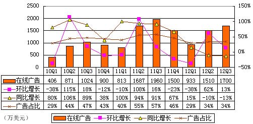 人人公司第三季度的在线广告业务收入为1700万美元,较去年同期下降13.7%。下滑的原因在于宏观经济环境不好的背景下品牌广告主降低在人人网广告投入,行业竞争的加剧以及用户流量从PC到移动终端的持续迁移。