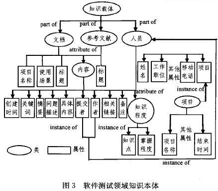 本体在知识检索子系统中主要扮演知识库的角色,即首先对软件测试领域的概念分类、建立概念之间关系约束的描述,然后以此为基础构建详细的软件测试领域知识库,主要包括软件测试领域的具体概念、概念之间的属性、概念之间的关系以及实例等知识。在知识检索时,根据用户请求的关键词来查找相应的概念或属性,并以此为出发点来检索某条本体信息是否与这些概念或属性相关,从而实现支持逻辑推理的智能检索。