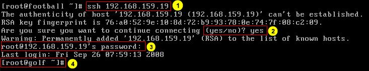 2:如果是第一次连接到远程计算机,由于OpenSSH不知道该计算机所以出现警告提示此处输入yes,OpenSSH会将这台计算机识别标记加入~/.ssh/know_hosts文件中,第二次连接时不会出现警告。