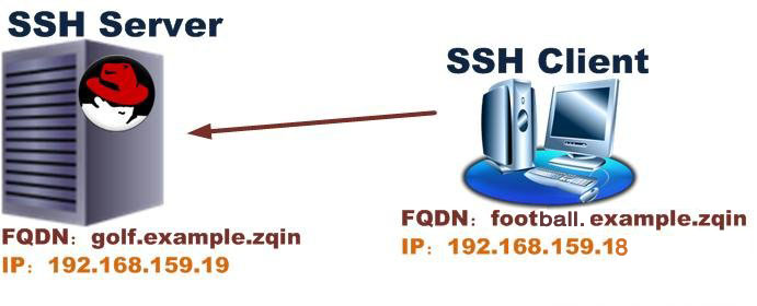 在实验过程中,将用户将在football.example.zqin上通过SSH远程登录到golf.example.zqin上。在讲述配置过程前先介绍几个在SSH中常用的命令: