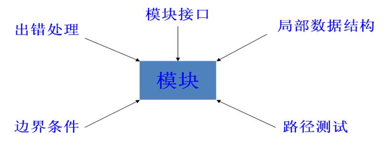单元测试针对每个程序的模块,主要测试5个方面的问题:模块接口、局部数据结构、边界条件、独立的路径和错误处理;如下图所示: