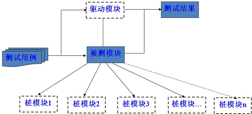 被测模块、驱动模块和桩模块共同构成了一个如下图所示的单元测试的测试环境: