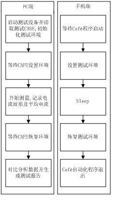 耗电量自动化测试工具由手机端和PC端两部分组成,PC端和手机端同步运行。手机端使用Café自动化测试框架,对不同测试CASE进行测试环境的设置和清理。PC端负责与设备连接,记录测试数据并保存,测试完毕后分析测试结果并自动生成报告。流程图如下: