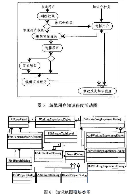 限于篇幅,整个系统各个模块的设计以及实现,这里不做详细介绍了。下面以简单图示的方式给出本系统的核心模块——知识地图模块的类设计和实现界面。知识地图模块分为两个部分:专家网络和搭建测试项目团队。普通用户在该模块可以编辑自己的项目经历,在编辑时可以选择项目导人数据,如果项目不存在,则可以自己编辑项目,然后导入项目数据,再编辑自己的项目经历,包括使用的技术、工作时间,项目职位、项目规模等等。知识分析员有权限选择其他用户编辑项目经历。在项目经历编辑完成之后,系统会根据用户对某些技术的使用时间来自行定义用户在这些知识点的知识程度,但是用户的知识程度多达到熟练级别,要想达到精通和专家级,必须由知识分析员来编辑用户的知识程度。图5是系统中专家网络定义模块的编辑用户知识程度活动图。