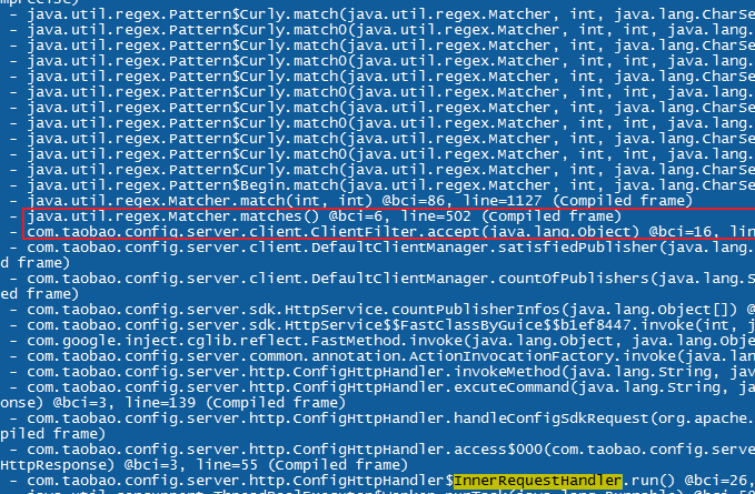 查看栈,发现一切都是由ClientFilter这个类开始,其使用了matcher.matches()方法。这样一来,很可能是由于输入了不规范的正则导致的了。于是查看输入日志,发现这么一个输入:
