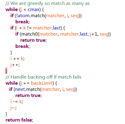 如下面的代码所示(java.util.regex.Pattern.Curly.match0(…)):