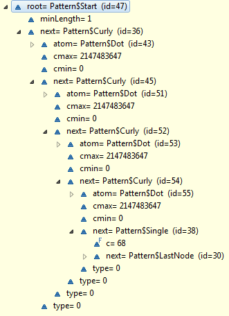 .*D,如果想匹配 testDdev,那么Java首先将 .* 转成 .{0, MAX}(这里的MAX应该是2亿多,具体可以看代码),那么 .{0, MAX} 得到的匹配是(java会自动在string后加上一个终止字符,这个字符只能java.util.regex.Pattern.LastNode匹配):