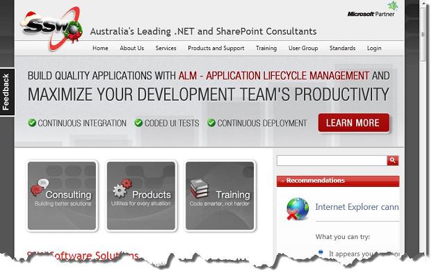 下图是利用持续部署推送到生产环境的SSW公司官方网站。注意下面一行小字,是由TFS的持续部署脚本自动生成的。这种持续部署的方式,再配合内部的虚拟化测试平台,可以保证变更以快的速度进入生产环境。