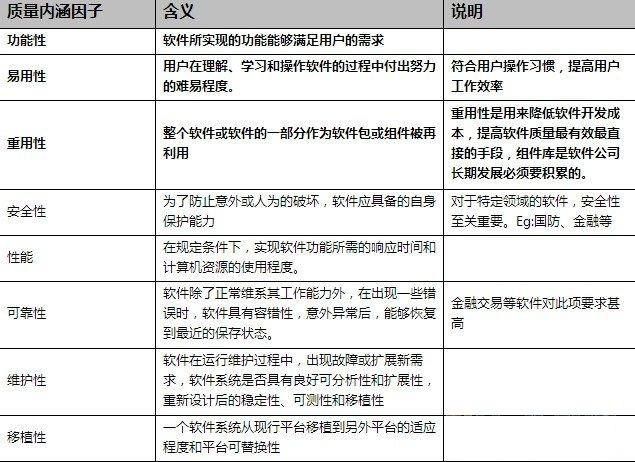 以客户为中心的软件产品质量要以用户满意为目标,质量内涵因子贯穿软件需求、设计、开发、交付等环节。下表为质量内涵因子: