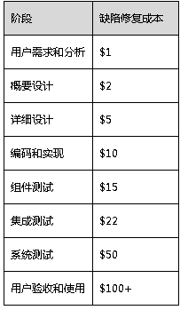 评审可以降低测试和开发的成本,因为在项目的早期发现和修复缺陷的成本比在测试执行阶段发现和修复缺陷的成本小得多。同时,有效的评审可以减少动态测试执行的时间。下表是业界统计得到的在不同阶段修复缺陷的成本比例。
