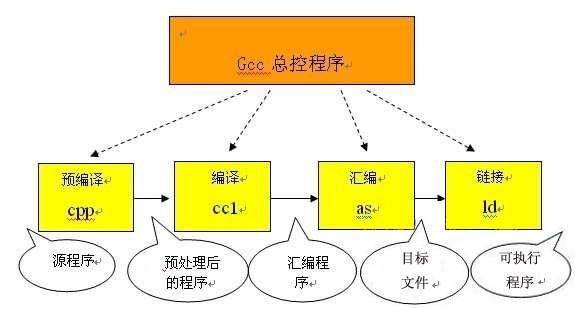 我们在linux使用的gcc编译器便是把以上的几个过程进行捆绑,使用户只使用一次命令把编译工作完成,这的确方便了编译工作,但对于初学者了解编译过程很不利了,下图便是gcc代理的编译过程: