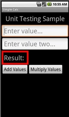 简单解析一下这个界面设计,我们使用了LinearLayout,以使得控件能在垂直方向竖向排列。界面中包括了显示标题“Unit Testing Sample”的textview,两个输入数字的edittext控件,一个FrameLayout控件中包含了一个水平的LinearLayout,在这个LinearLayout包含了一个显示结果的textview以及其提示文字“Result”,注意的是FrameLayout的背景颜色设置为红色,而LinearLayou设置成了黑色背景。
