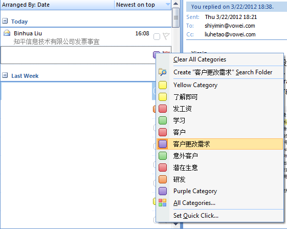 2、 但是在归类的时候,我分了很多小类,例如“客户抱怨”,这个分类我标成红色,意味着“重要且紧急”,而我看邮件的标题,知道它来自一个客户,而且是抱怨,我只要将其归类到“客户抱怨”里,自动使用红色标识,而在处理的时候,我顺着“红绿紫黄”的顺序自然而然顺着事情的轻重缓急来处理了,如下图: