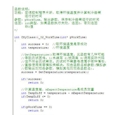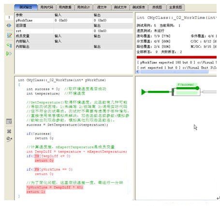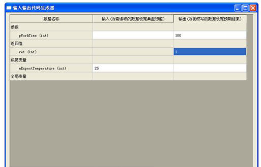 点击,打开输入输出代码生成器,生成用例代码。预设的目标温度由成员变量mExpectTemperature保存,设为25(度),假设环境温度为28度,那么参数*pWorkTime的值应为180(秒,温度差1度,运行60秒),返回值表示计算是否成功,设为1,表示成功。