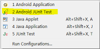 配置完1.5的SDKADT0.9,运行第一个1.5的sample的时候我看到Run as中多出了一个 “Android JUnit Test”的选项(以前是在Debug中)。