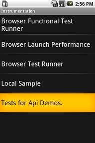 第5步,现在,我们可以通过Dev Tools中的Instrumentation来执行APIDemo Test了。找到Instrumentation中的”Tests for API Demos.”,点击即可开始测试。