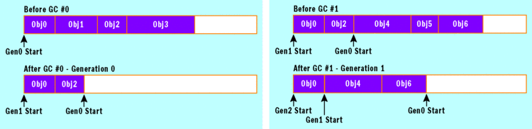 上图中第一次垃圾回收之前有四个对象obj0-3;在第一垃圾回收之后obj1和obj3被回收了,同时obj2和obj0移动到一起了;在第二次垃圾回收之前有分配了三个对象obj4-6;在第二次执行垃圾回收之后obj2和obj5被回收了,obj4和obj6被移动到obj0旁边。