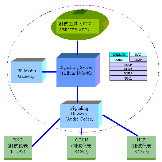 在测试过程中,测试系统采用的是泰克公司的协议测试仪表K1297。K1297是便携式多协议/多接口测试仪,特别适用于网络网关测试,支持多种测试模式,如监测、模拟/仿真和一致性测试(接收,性能检验和兼容性)。被测系统SS通过信令网关与测试系统相连,被测协议实现体是我们前面提到的SS中集成的Trillium协议栈。我们主要对GMM/SM,MAP和RANAP三个协议进行测试,目的是检验Trillium公司的协议实现是否与协议标准一致。测试组网图如图3所示。在测试时,我们可以用K1297来模拟HLR,RNC或者GGSN,被测系统位于核心网中SGSN侧。