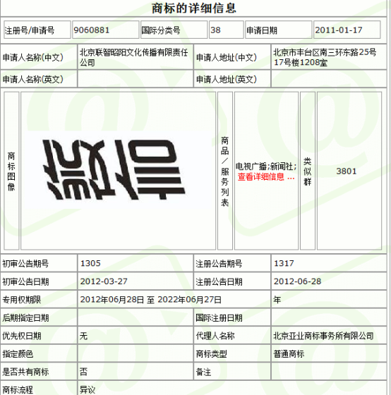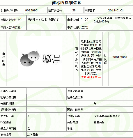 其中,关键的第38类电信及通信服务被北京联智昭阳文化传播有限责任公司(以下简称“联智”)抢注,申请日期为2011年1月17日,而腾讯公司对第38类商标的申请日期为2011年1月24日,较上述公司晚一个星期。