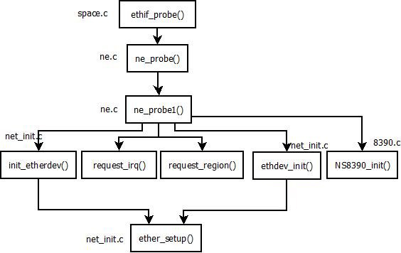 ethif_probe()函数会调用函数ne_probe()探测函数,而该函数对设备地址进行检查后调用ne_probe1()函数,具体工作有ne_probe1()函数完成。