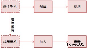 接着是“群组”。所谓“群组”,主要是在多人一起驾车出去时,可以通过“群组”来共享路线,实时导航,并彼此看到对方,此外还有一些附加功能,如聊天等。“群组”的整个逻辑稍微有点复杂:首先,需要一个人(群主)来创建一个群组,创建好之后,需要他来告知其他人群组名、密码,这个过程一般通过短信邀请来实现,收到短信的人(成员)在获取群组名密码之后,进入导航,搜索群组名,输入密码,加入;然后群主规划路线,规划好后,成员即可在地图上看到共享的路线并可以看到彼此的位置。图示如下: