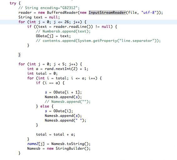 接下来是测试,第一步进行了网络上所有中文字的抓取,相当于准备好中文,英语,法语等各种语言组合的基础的字符串。接下来的例子是中文,其他语言以此类推。然后我们可以写一个很简单的程序将这些基础的字符串组合,变成如下图,这些txt文件保存在android的assets文件夹中,方便android程序读取。