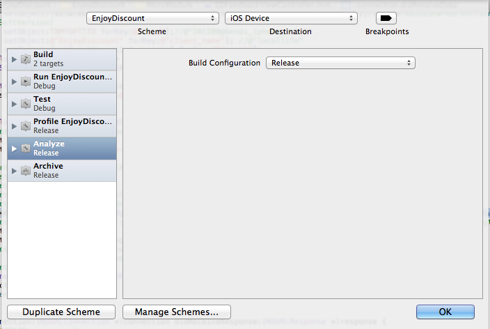 关于代码静态检查好是针对iphoneos(好不要采用iOSSimulator)的Release版本进行静态扫描;在Xcode中可以通过Product->Edit Scheme来进行设置: