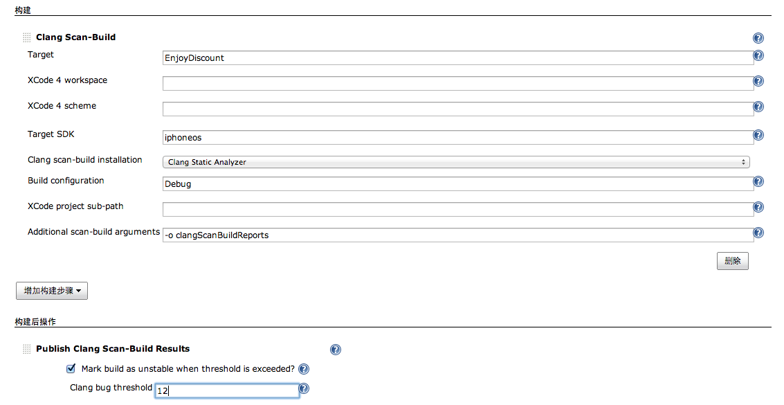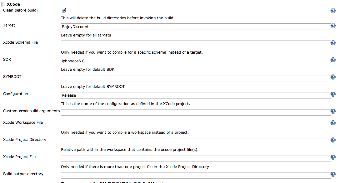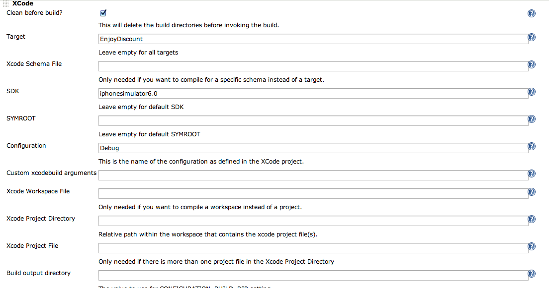 开始的时候工程的构建是通过shell脚本来进行的,后来发现在jenkins中提供了一个Xcode Plugin的插件,通过该插件可以可视化的配置build的参数,这个插件终使用的仍然是xcodebuild的命令行;Xcode构建的配置如下: