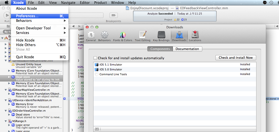 Xcode提供了命令行工具来通过命令行进行工程的构建,在Xcode4.5中命令行工具是默认不安装的,因此需要首先安装命令行工具,安装方式如下: