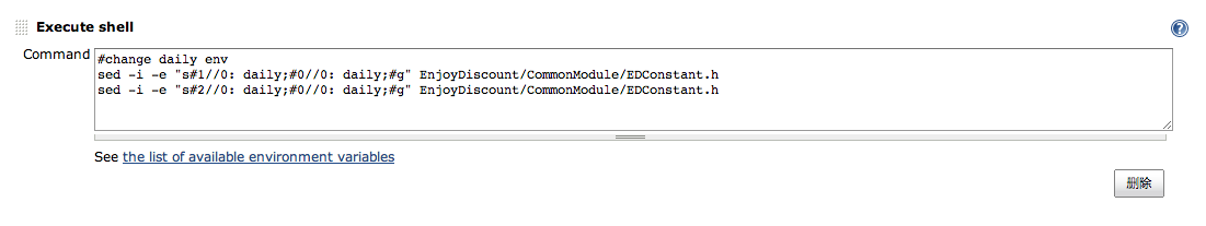 这里的配置项的用法和说明在后面的提示中都有包括,那么说说项目中的一些需求,基本上现在的项目测试自动化脚本都是在测试环境运行,然后发布的内测包都是线上环境的,而又不想把这样的工作通过jenkins中的两个Job来实现,因此这里的处理方式是设置了两个Xcode Step,第一个构建测试环境下用于进行自动化验证的版本(上图),第二个用于构建内测版本的线上环境(下图);