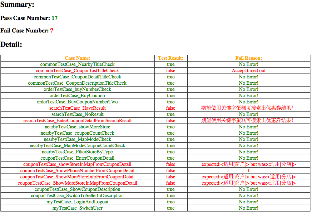 <!--[if !supportLists]-->1) <!--[endif]-->开始的时候没有使用jenkins,同时由于机器的IP地址没有办法固定下来,因此没有办法得到需要的测试报告,于是提供了一套机制来生成测试报告,测试报告的生成结果如下: