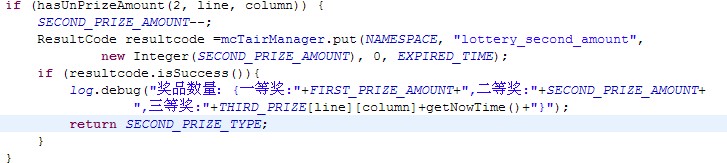 实现的是更新剩余二等奖奖数,及时统计到tair的工作,低流量下一般不会有问题,但是并发量大的时候,若同时有2个用户抽到二等奖均取到同个SECOND_PRIZE_AMOUNT值,均需对其进行减1的工作,上次未操作完毕,后一次已经取到开始处理,两次操作后,只让SECOND_PRIZE_AMOUNT值减了1, 但应该是要减2,这样累积多个用户并发操作后,便会出现少算剩余奖数而多送奖的事故了。