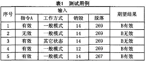 1.指令A:{“有效”,“无效”};2.工作方式等价类为{“一般模式”、其它状态};3.销毁时间等价类为{大于13秒、不大于13秒};4.脱落时间等价类为{大于268秒、不大于268秒}。