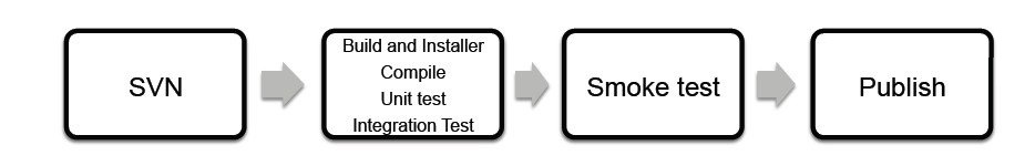 团队是一个敏捷分布开发团队(三地协作,均有开发人员,且有时差)。整个团队有150多人,分成十几个团队,每个团队都有一个完成的结构(BA/DEV/QA),其中有一个是项目持续集成团队(项目之初,大约有五六个人,工作负荷很大,项目运行一段时间后只要两个人足够了)。使用SVN做版本管理工具,在Windows2003上使用NAT, MSbuild和batch脚本进行构建管理,初使用CC.NET做为持续集成服务器,后来使用Cruise(Go)。