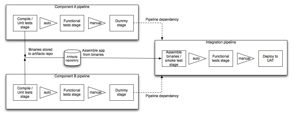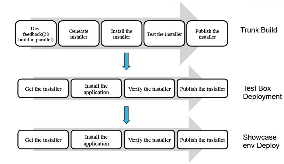 由于有很多个团队,每个团队都有多个测试环境。如果全部使用手工部署分花费很多时间。所以,每个团队建立三个构建管道,其目标分别为:(1)得到测试过的 installer;(2)部署到测试环境中;(3)将通过测试的installer部署到演示环境中。前一个构建成功后,可以触发下一个(自动或手动)。