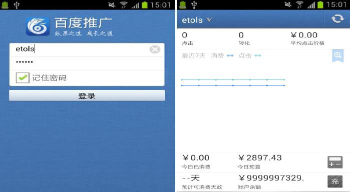 以移动凤巢的登陆页面为例,LoginActivity中有三个控件:用户名EditText,密码EditText,以及提交按钮Button,如下图一,当登陆成功后进入MainActivity,如下图二: