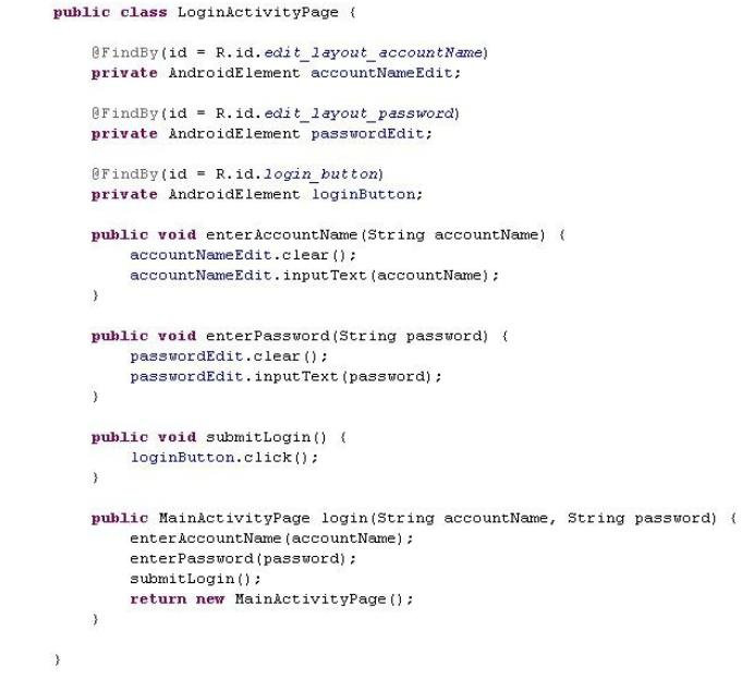其中LoginActivityPage的内容如下,先不用关心@FindBy这种注解,它不是robotium自带的,主要作用是能够在运行时将控件注入到ActivityPage之中:
