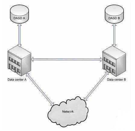 图中两个数据中心是分离的,这对于进行同步磁盘输入输出来说,实在太远了,这导致了很多需求。首先每个数据中心必须得有自己的直接存取存储设备(Direct Access Storage Device,简称DASD)场所来进行管理。第二是同步硬件复制会因为网络延迟而无法工作。后,距离也意味着,每个数据中心的逻辑分区(logical partition,简称LPAR)不能处于同一个Sysplex(Systems Complex,系统联合体)里面。