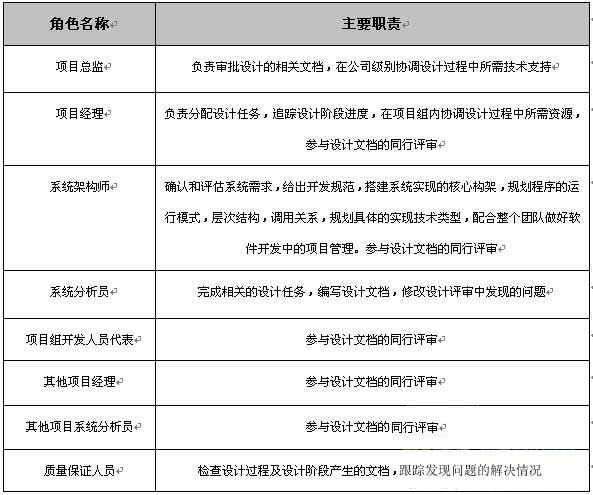软件的灵魂来自哪里?它是由其设计人员和整个团队所赋予的,一个没有理想和目标的团队永远做不出具有生命和活力的项目。软件设计的成功源自设计团队集体智慧的迸发,在此过程中系统架构师或设计人员可以针对自己的设计思想提出关于项目管理的解决方案或建议,充分调动团队成员的积极性,从而保障自己的设计方案顺利落地。另一方面,设计阶段的项目管理直接影响各类资源的有效利用,影响到产生符合设计目标的设计方案及项目组工作效率的提高等问题。只有在设计阶段施以有效的项目管理,才能产生高品质的设计方案。项目管理的首要工作是在做好沟通协调的基础上做到人尽其才,才尽其用。下面是软件项目设计阶段角色与职责分配,仅供参考: