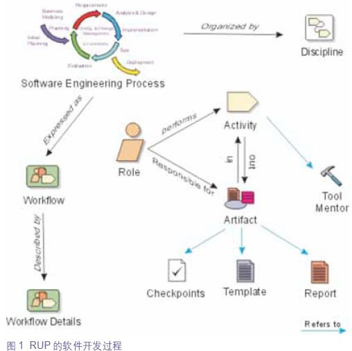 在RUP中,整个软件开发过程如图1所示,它以指定的工件为输入,通过软件开发角色和标准化的软件开发活动,生产出满足质量要求的输出工件。