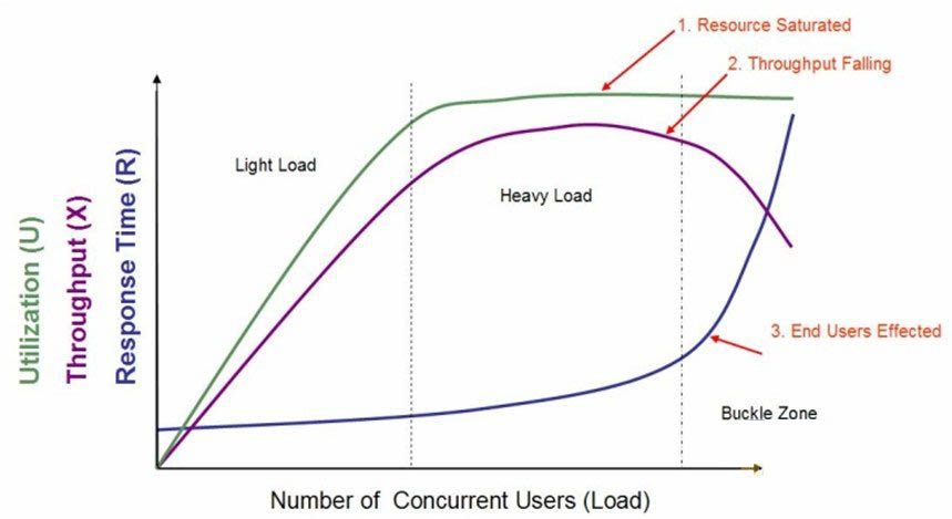 验证了系统是否可满足预期的压力后,还需要知道系统能够承受的大压力,也是容量。一般通过“拐点法”进行测试,逐步增大系统的压力,直到性能指标不可接受或者出现了明显的拐点。如图: