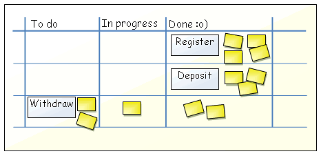 下面是一个示例。假设我们已经实现了两个故事:“开户(Register)”和“存款(Deposit)”。它们都是“已完成”的,也是说通过了单元测试、集成测试,并且处于“可发布”状态。我们已经开始处理“取款(Withdraw)”这个故事,但是它还没有“完成”。任务板看起来会像下面这张图示一样: