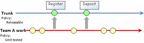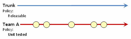 很好,现在我们有两个分支了。一个稳定的分支(主干)和一个稍微不那么稳定的分支(团队分支)。团队分支是红色的,表示它不太稳定;例如:这个分支通过了单元测试,但是它可能还没有完成集成测试,所以还没有稳定到可以发布的状态。好,现在团队有地方可以检入正在进行中的工作了!